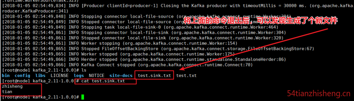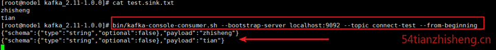 在启动过程中,您会看到一些日志消息,其中一些指示连接器正在实例化。Kafka Connect 进程启动后,源连接器应该开始读取 test.txt topic connect-test,并将其生成 topic ,并且接收器连接器应该开始读取 topic 中的消息 connect-test 并将其写入文件 test.sink.txt。我们可以通过检查输出文件的内容来验证通过整个管道传输的数据: