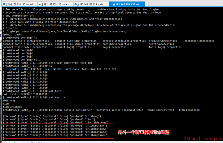 数据存储在 Kafka topic 中 connect-test,因此我们也可以运行控制台使用者来查看 topic 中的数据