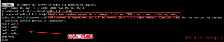使用 kafka-console-consumer.sh 接收消息并在终端打印:
