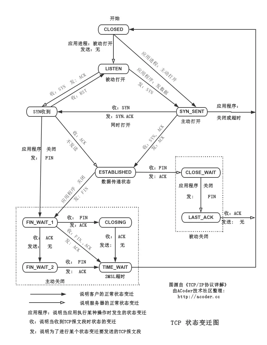 图片中的所有状态对应于TCP的建立和连接过程,下面简单介绍一下这几种状态: