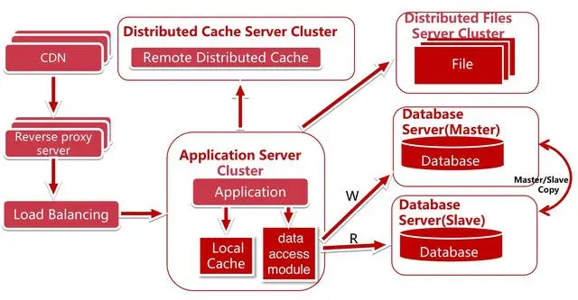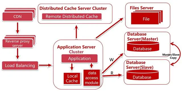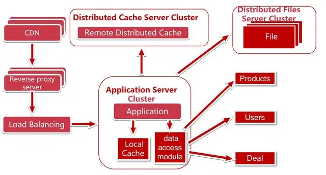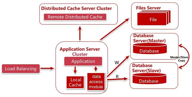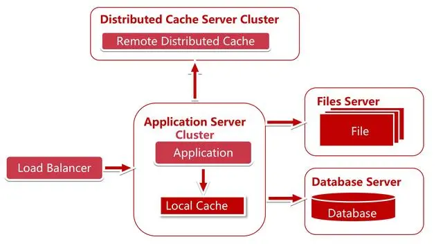 因为 80% 的业务访问都集中在 20% 的数据上,也就是我们经常说的28法则。如果我们能将这部分数据缓存下来,性能一下子就上来了。而缓存又分为两种:本地缓存和远程缓存缓存,以及远程分布式缓存,我们这里面的远程缓存图上画的是分布式的缓存集群(Cluster)。