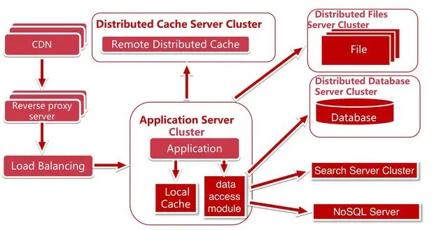 使用搜索引擎,解决数据查询问题。部分场景可使用 NoSQL 提高性能,开发数据统一访问模块,解决上层应用开发的数据源问题。如图data access module 可以访问数据库,搜索引擎,NoSQL