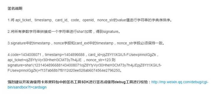 - 小程序wx.addCard()中,cardExt参数是一个字符串而不是对象,所以要将签名连同其他参数转为字符串后再赋值。