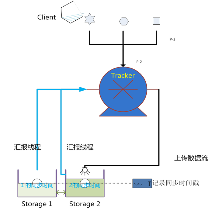 storage的同步进度会作为元数据的一部分汇报到tracker上,tracke在选择读storage的时候会以同步进度作为参考。 比如一个group内有A、B、C三个storage server,A向C同步到进度为T1 (T1以前写的文件都已经同步到B上了),B向C同步到时间戳为T2(T2 > T1),tracker接收到这些同步进度信息时,就会进行整理,将最小的那个做为C的同步时间戳,本例中T1即为C的同步时间戳为T1(即所有T1以前写的数据都已经同步到C上了);同理,根据上述规则,tracker会为A、B生成一个同步时间戳。