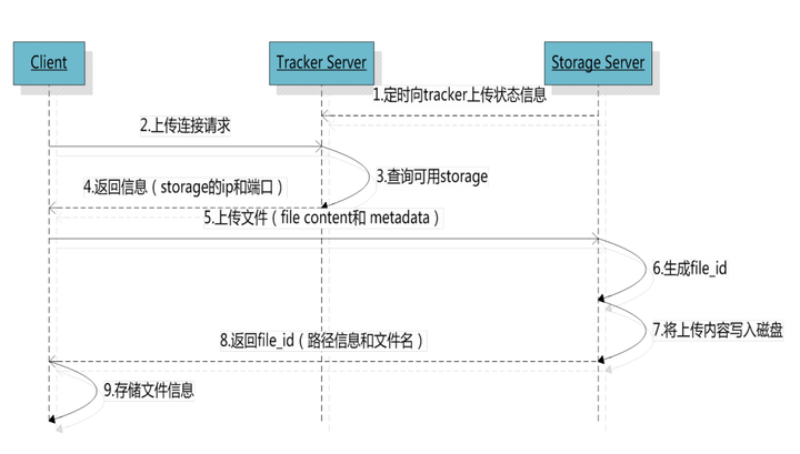 首先客户端请求Tracker服务获取到存储服务器的ip地址和端口,然后客户端根据返回的IP地址和端口号请求上传文件,存储服务器接收到请求后生产文件,并且将文件内容写入磁盘并返回给客户端file_id、路径信息、文件名等信息,客户端保存相关信息上传完毕。