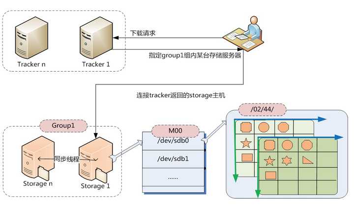 写文件时,客户端将文件写至group内一个storage server即认为写文件成功,storage server写完文件后,会由后台线程将文件同步至同group内其他的storage server。