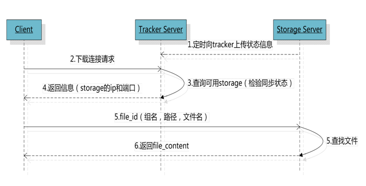 客户端带上文件名信息请求Tracker服务获取到存储服务器的ip地址和端口,然后客户端根据返回的IP地址和端口号请求下载文件,存储服务器接收到请求后返回文件给客户端。