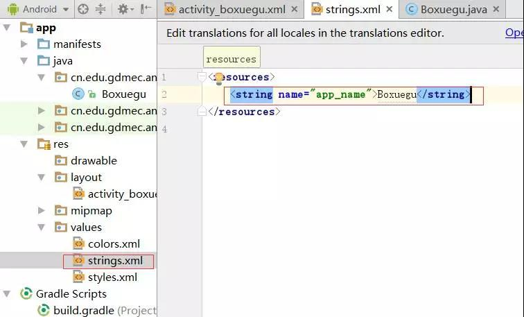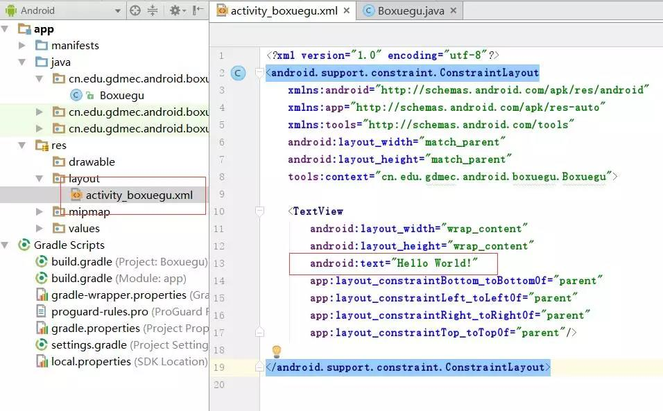 那么我们如何用textView_text呢?在布局文件中更新代码res/layout/ activity _ boxuegu.xml的文件中: