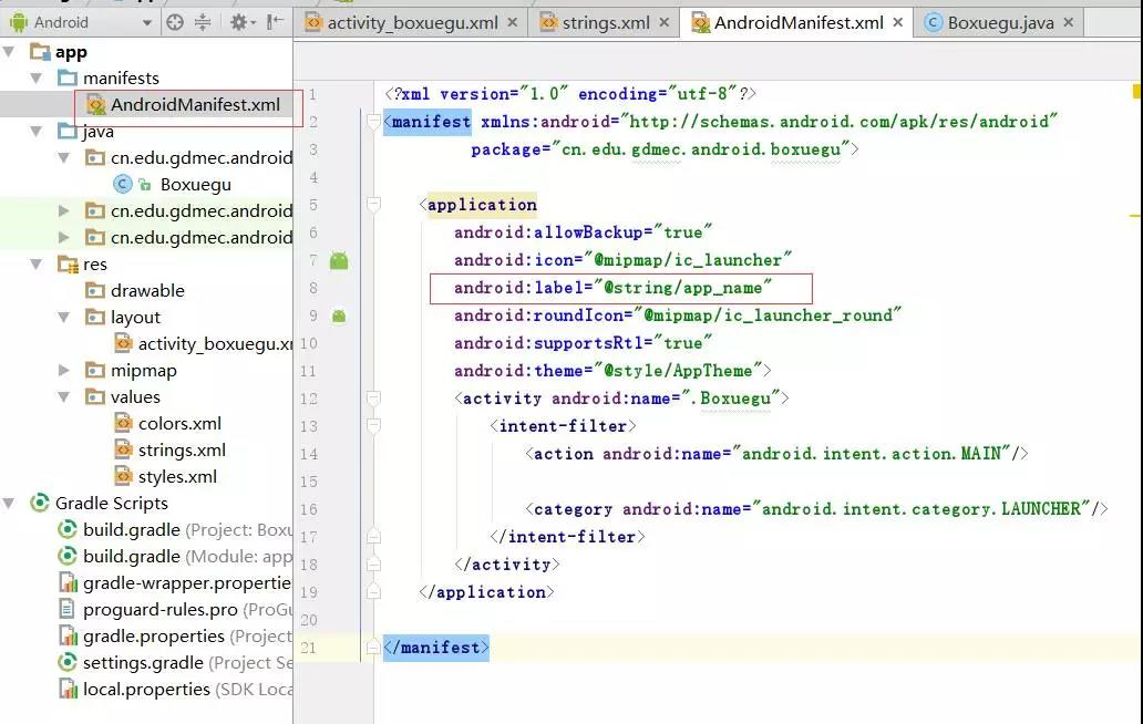 可以知道这里 android:label=”@string/app_name”,就是用来显示软件名称的。其中可以先了解一下这几行代码: