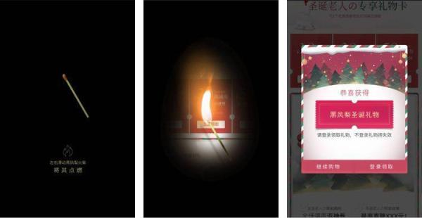 点评:网易严选在圣诞节做的活动。你要领取火柴,点燃它,然后手机屏幕一直往下滑,它会照亮经过的地方,最后停在有礼盒的地方,点击打开,恭喜你,成功领取优惠券啦。不过活动现在已经结束了。
