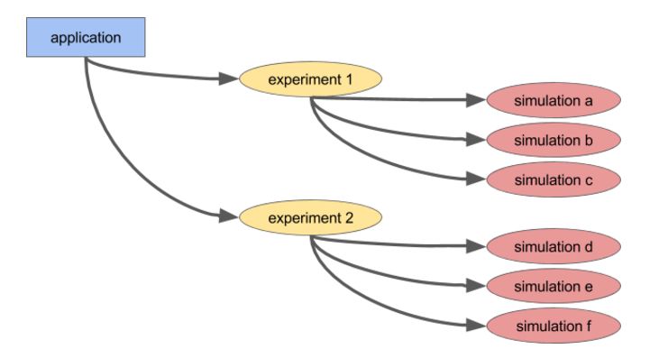 一个嵌套并行的简单例子。一个应用运行两个并行实验(每个都是长时间运行任务),每个实验运行一定数量的并行模拟(每一个同时也是一个任务)。