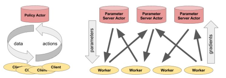 图左:actor 为客户端进程提供预测/操作。图右:多个参数服务器 actor 使用多个工作进程执行分布式训练。