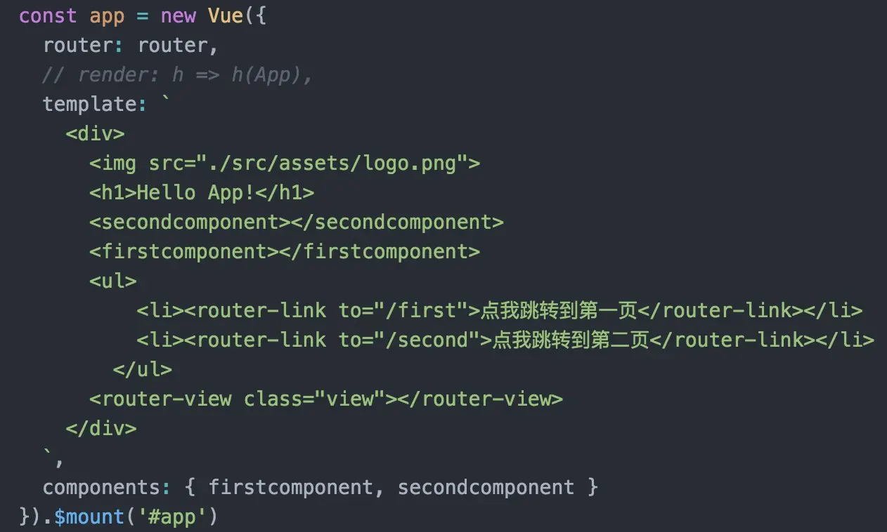 // 路由器会创建一个 App 实例,并且挂载到选择符 #app 匹配的元素上。