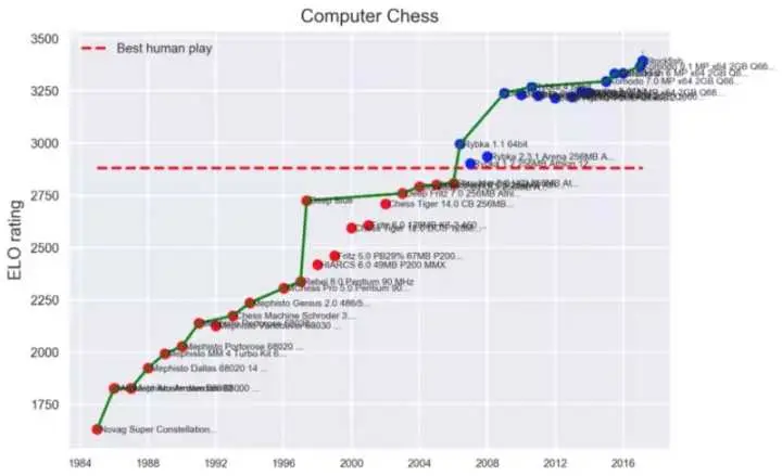 以下一项 AI 实例。图中所示为上世纪八十年代到现在计算机在国际象棋领域的表现提升趋势。垂直轴所示为 Elo 等级,好衡量象棋技巧的自然度量,其定义为如果 A 的 Elo 点数比 B 高 100 点,则 A 在与 B 对局时的胜率则为 64%。