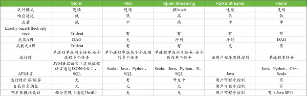 在资源池方面,Flink和Heron都可以与多种资源池合作,包括Mesos/Aurora、YARN、Kubernetes等。