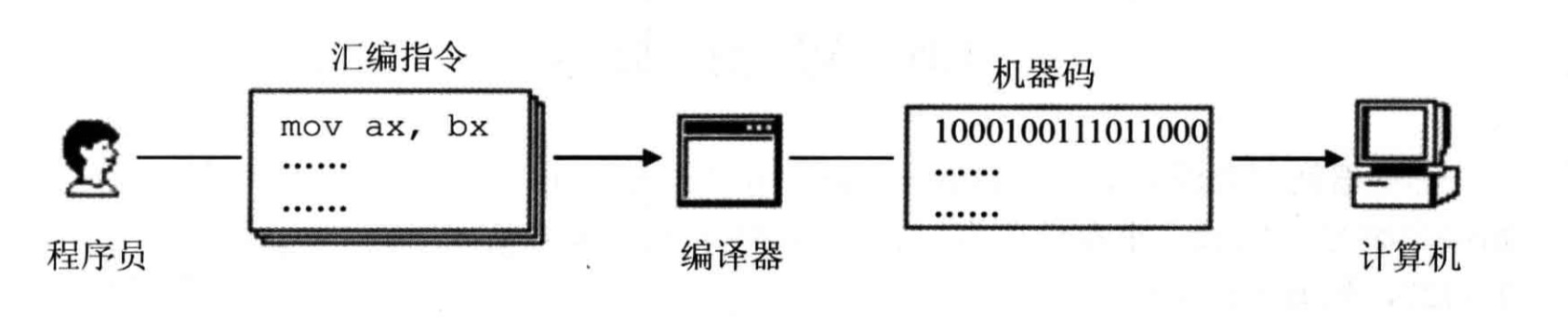程序员就用汇编指令编写程序。 计算机能读懂的只有机器指令,所以就需要一个编译器来把汇编指令转换为机器指令。如下图: