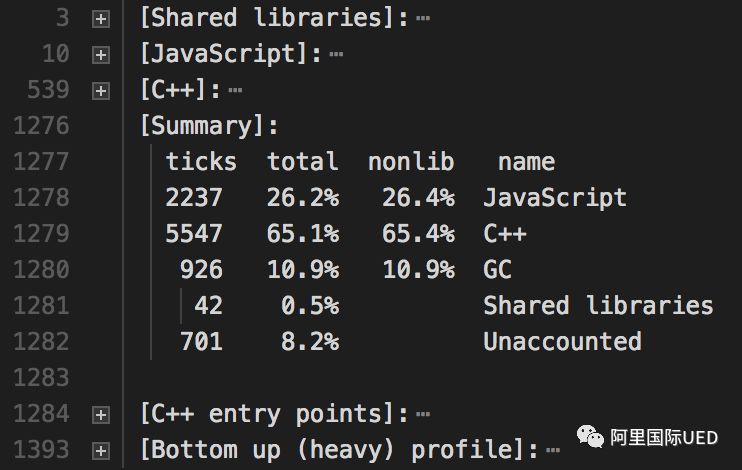 profile.txt文件如下图,包括JS和C++代码各消耗多少ticks, 具体分析方法详见 node profile文档(https://nodejs.org/uk/docs/guides/simple-profiling/)