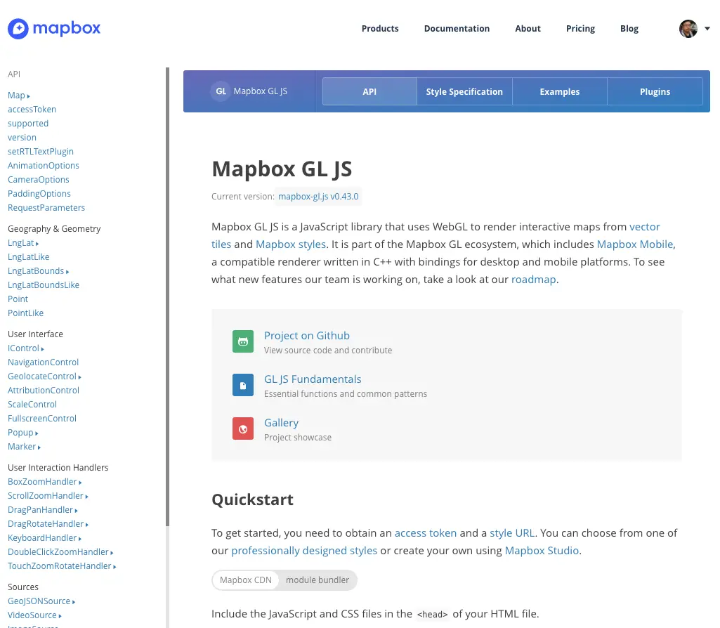 顾名思义,API 是一般框架(类库)提供给用户的全部接口(方法)的说明书;Style Specification 是 Mapbox 地图的样式规范;Example 是一些常用功能或常见业务的代码示例,囊括了使用 Mapbox 所能实现的大部分功能效果;Plugins 则是官方推荐的可与 mapbox-gl 一同使用的一些增效插件和开源项目,如一些第三方的UI控件、显示类插件、框架集成工具、开发辅助工具、实用工具类库等等。