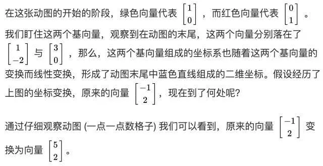根据上面的方法,锁定绿色与红色基向量末尾的位置,这幅动图的线性变换矩阵为