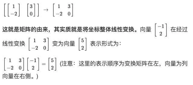 矩阵乘法我更喜欢称作线性转换。一个矩阵乘以向量中,矩阵相当于一个转换函数,而向量是一个输入,已知了输入和函数,我们就可以知道输出。这里需要强调的是,向量共有两种形式,一种为列向量,一种为行向量。在默认情况下,向量是指列向量。大部分的国内教材中,并没有特意提到这一点。很多人接触到编写代码时,都是以行向量的形式开始学习,导致后续有很多概念产生混淆。在本文中,若无特殊说明,向量的形式默认为列向量。