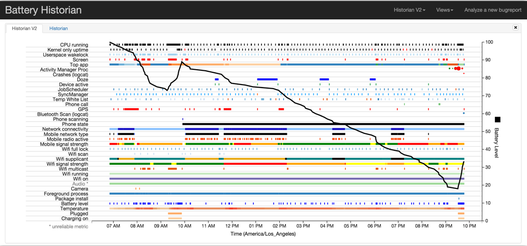 在 Android5.0 以前,在应用中测试电量消耗比较麻烦,也不准确,5.0 之后专门引入了一个获取设备上电量消耗信息的 API:Battery Historian。Battery Historian 是一款由 Google 提供的 Android 系统电量分析工具,是一款图形化数据分析工具,直观地展示出手机的电量消耗过程,通过输入电量分析文件,显示消耗情况,最后提供一些可供参考电量优化的方法。