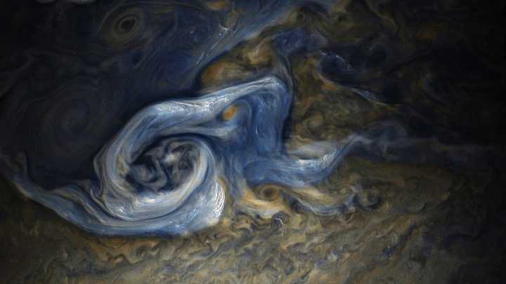 朱诺号另外一张特别有名的照片是这张「木星蓝调」,于 2017 年 10 月 24 日拍摄。从图中可以看到云层在运动剧烈的气旋中绵延数千英里: