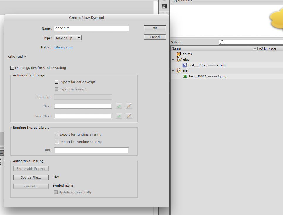 - 建立新的元件,还是使用"影片剪辑"(movie clip),然后拖进anims文件夹中。这就是需要制作的动作了。