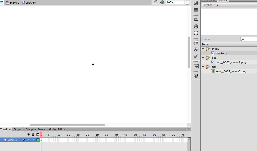 - 依次生成png图片对应的元件(影片剪辑),把图片拖到元件中。使图片居中。元件名字应该同图片的名字完全相同。这一步可以使用脚本(“1.根据png创建元件“)代替这个操作。