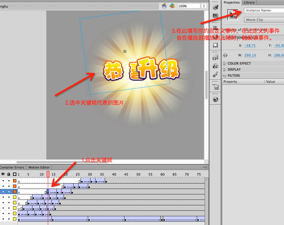 如果需要给关键帧添加事件,需要选中该关键帧(首先在timeline中选中关键帧,然后在主页面中选中该帧代表的图片,过程中最好隐藏timeline中的其它层),然后点击右侧与library同级的标签页properties。在第一行标有 < Instance Name > 的输入框,输入你的事件名,程序能够在播放到这一帧的时候,触发这个事件(在代码中,事件对应的字段为"mark")。