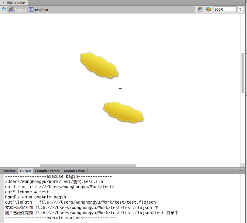 保存文档,请务必保存文档,否则脚本不生效,并按照如下规则命名: fla的命名应该以 "." 分为3部分: 测试.test.fla 第一部分:中文,对本文件的中文描述。(不重要,可以随意取。) 第二部分:英文,表示本文件的英文标识符。(重要,在代码中会使用到这个关键字。) 第三部分:后缀,默认即可不用管。(使用.fla即可。) 其中第一部分中文可忽略。