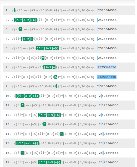 就是先从全局环顾一遍正则,(然后断定结果,)再做进一步匹配处理。环视的作用相当于对其所在位置加了一个附加条件,只有满足这个条件,环视子表达式才能匹配成功。其实我们已经接触过了,^ $ \b都是零宽断言,他们并没有任何实际内容,但是也确定某种限制条件(断言)。