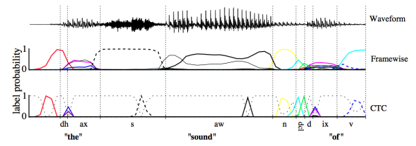 CTC可以看成是一个分类方法,甚至可以看作是目标函数。在构建end-to-end声学模型的过程中,CTC起到了很好的自动对齐的效果。同传统的基于CD-DNN-HMM的方法相比,对齐效果引用文章[Alex Graves,2006]中的图是这样的效果: