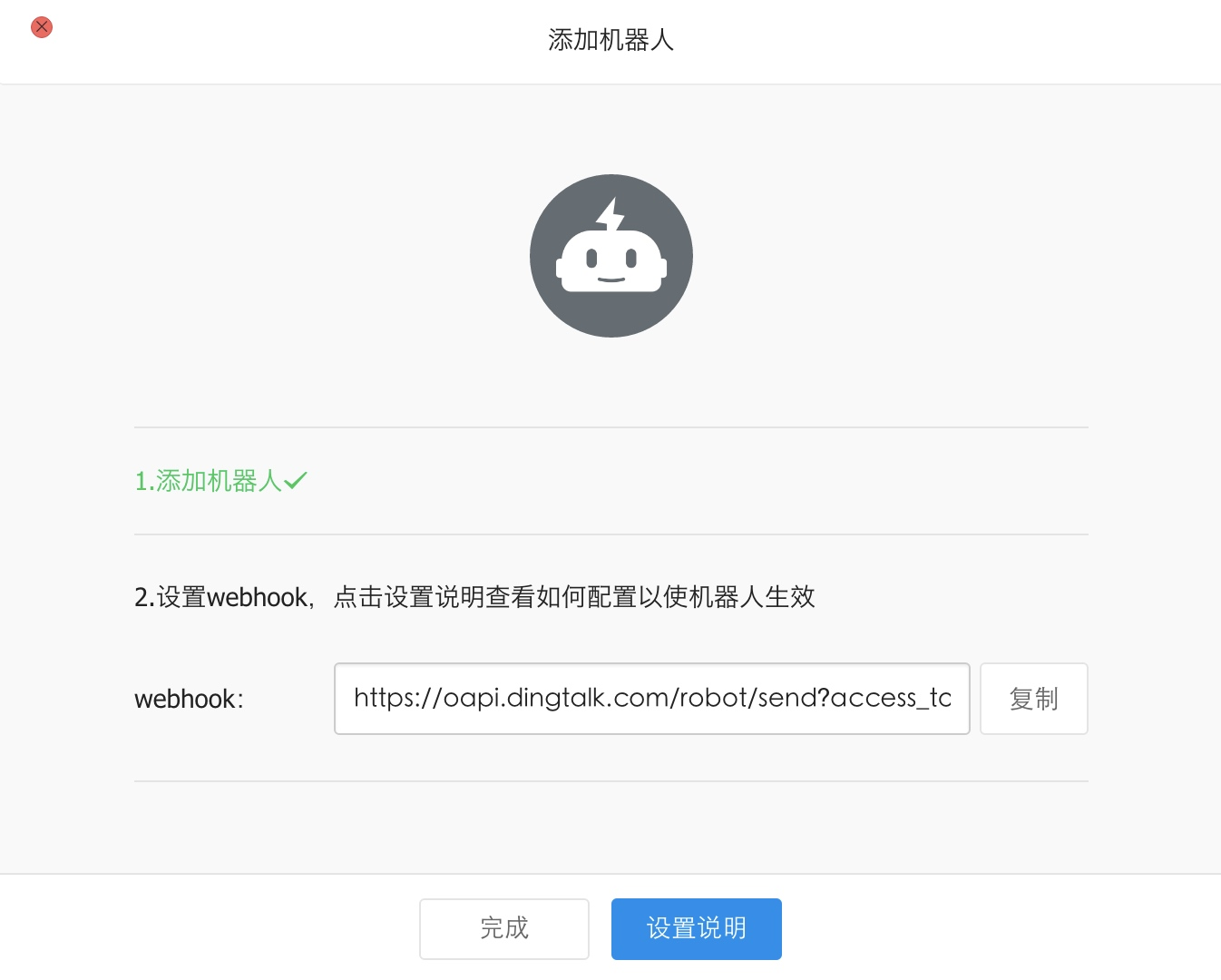 这之后,记得复制出来该机器人的 Webhook 链接,如: