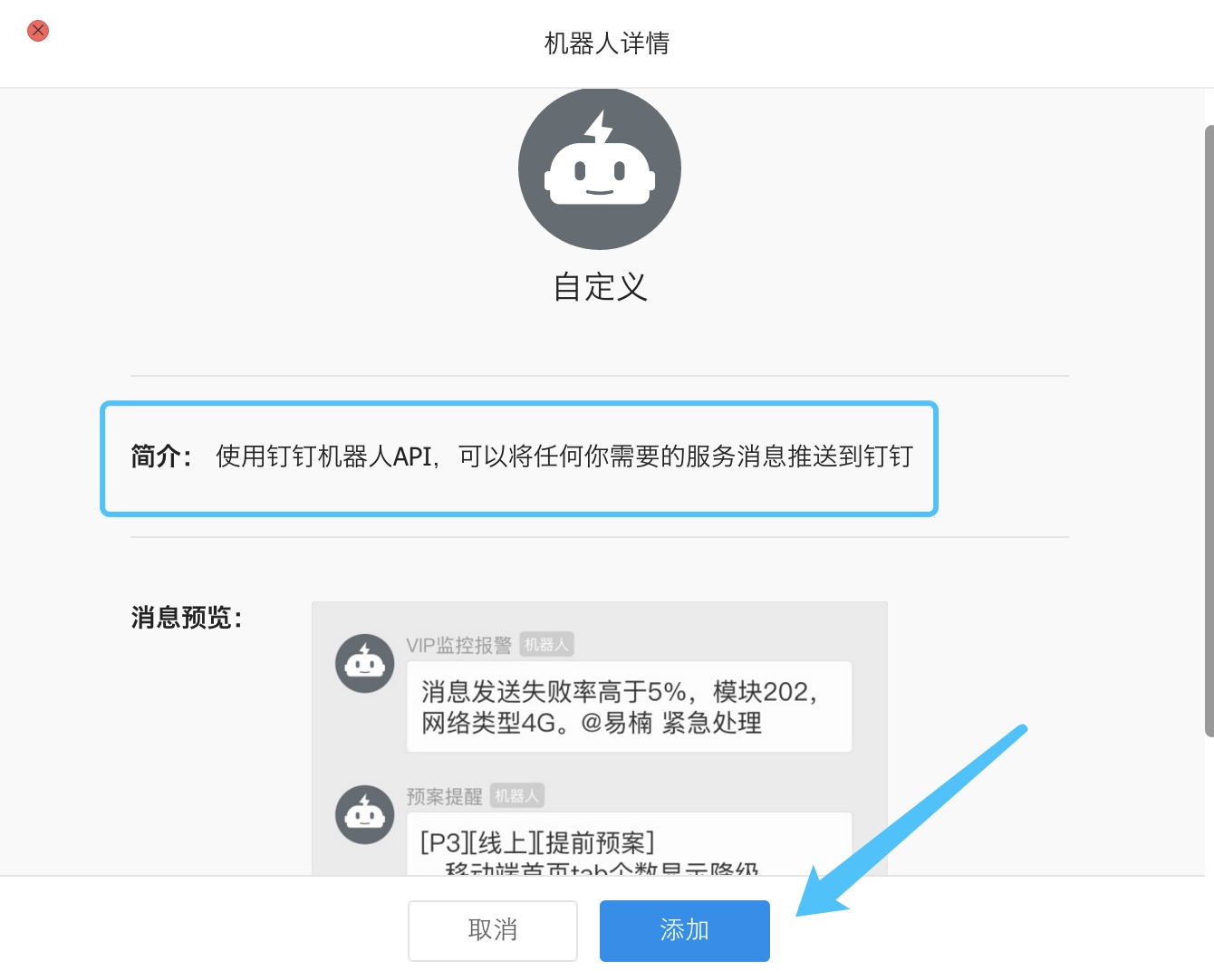 4. 选择添加后,随便给机器人起个名字