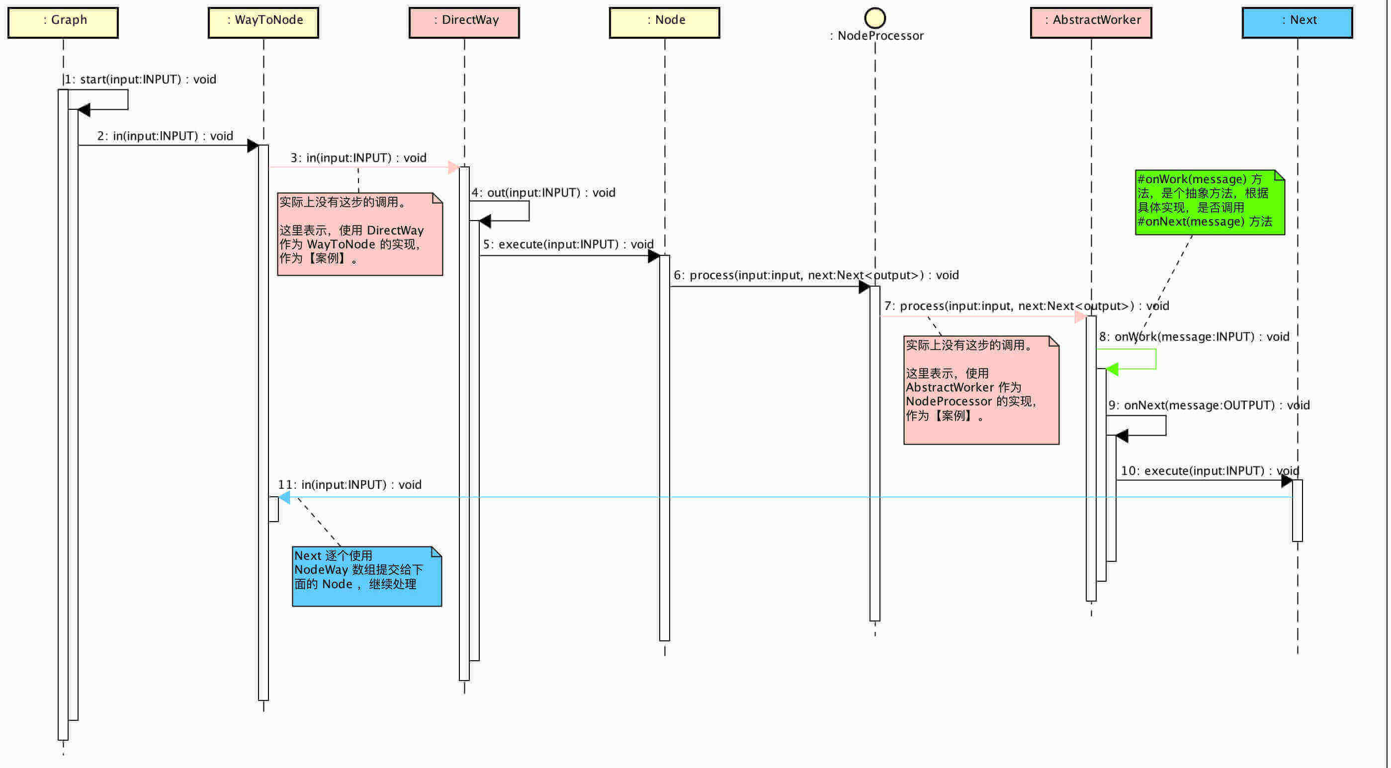 - 粉色箭头:当数据进来时,提交给 Grpah 。按照定义的拓扑图,使用 NodeWay 提交给 Node ,NodeProcessor 进行处理。