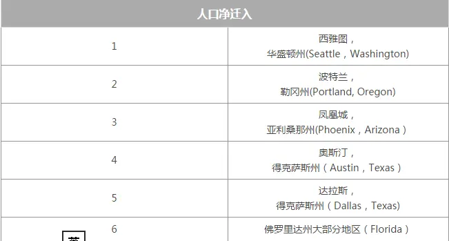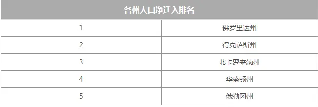 2016年美国人口迁移报告中的数据显示,2016全美各大州人口净迁入排名前五的大洲如下(按流入人口净值):