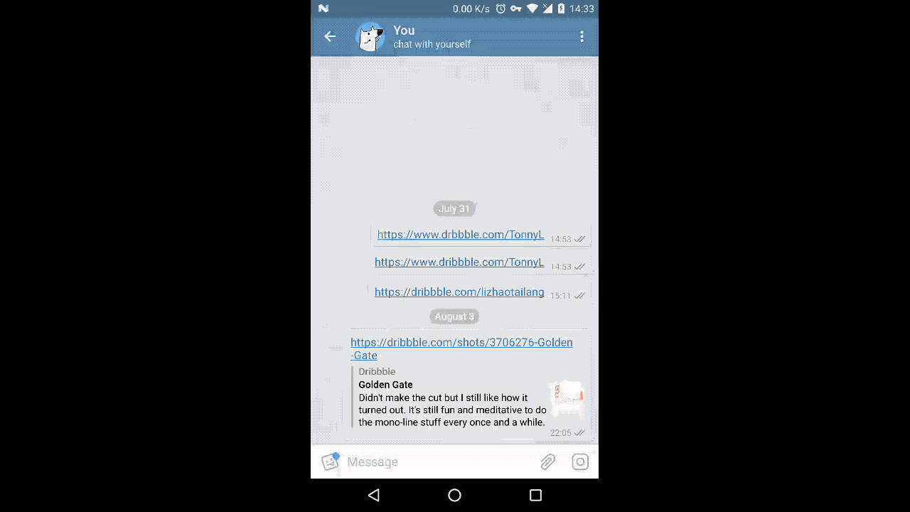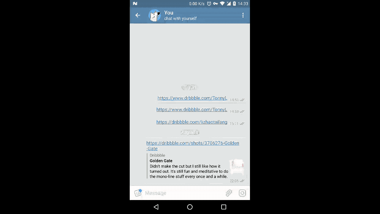 一个在Telegram中的dribbble链接, 点击后直接跳转到我的 Mango中, 是不是很神奇?