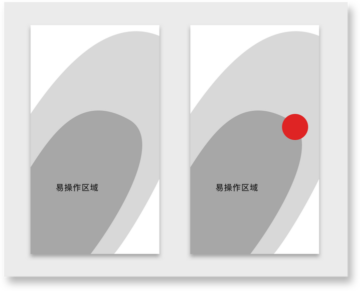 正常来说,大部分设计师基本都是在一张 375x667 的画板上开始设计界面的。所以假如设计师是按照这个热区来设计界面中功能位置的话,重要功能应该是放置在「易操作区域」附近的(如下图)。