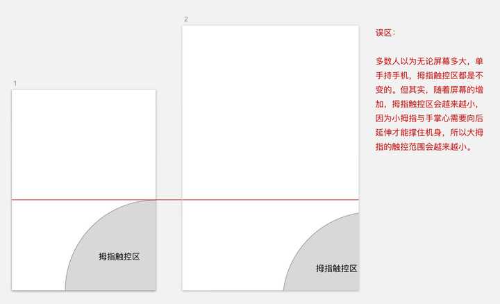 这里再给大家普及一个知识:大部分人误以为,手指在屏幕上的热区是永恒不变的,但其实手指热区会根据设备的变大而缩小。因为手掌支撑设备的重心靠后走了,所以拇指操控屏幕的范围也就变小了。详情见下图。(提示:这里的热区图都是我自己随意画的,如果想学习的最好找些比较规范的资料。另外,我这里有本专门讲屏幕热区这的电子书,需要的在微信公众号后台回复:热区)