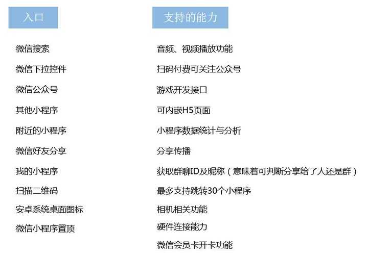 综述,结合一年小程序的迭代情况。我们能看出迭代速度和能力开放的维度都有了更大的加持。根据公开的迭代信息, 目前小程序可支持的能力如下图。