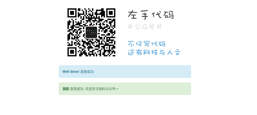 我们在 open 回调中,生成一张临时的二维码,二维码的场景值就是客户端连接的文件描述符,这样就可以保证每个客户端的唯一性.有效时间设置为 120 秒,防止一张二维码被多次扫码使用。消息 push 到客户端的时候必须要 json,方便客户端处理。客户端代码也很简单: