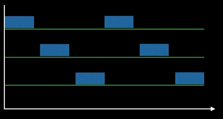 并发,是在同一个cpu上同时(不是真正的同时,而是看来是同时,因为cpu要在多个程序间切换)运行多个程序。如下图
