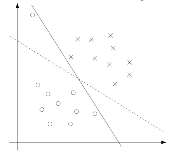 对于一个线性分类器,选择上面给定的函数 g (取值范围为{-1, 1}),函数边界的一个性质却使得这个分类器并不具有对置信度的良好量度。例如上面给定的这个函数 g,我们会发现,如果用 2w 替换掉 w,然后用 2b 替换 b,那么由于有 ,所以这样改变也并不会影响