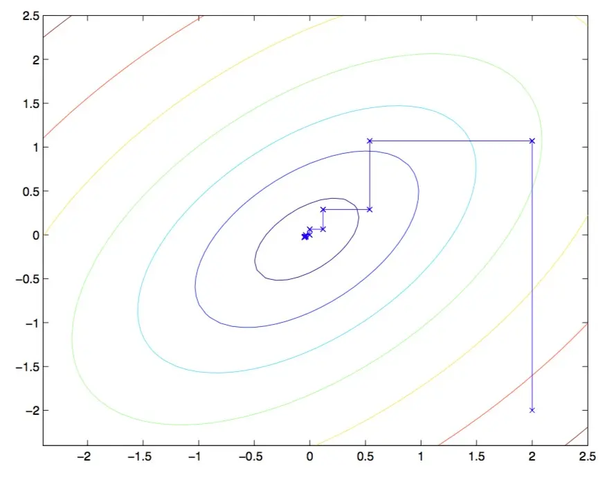 上图中的椭圆形就是我们要优化的二次函数的轮廓线。坐标上升算法的初始值设置为 (2, -2),此外图中还标示了到全局最大值的路径。要注意,坐标上升法的每一步中,移动的方向都是平行于某个坐标轴的(parallel to one of the axes),因为每次都只对一个变量进行了优化。