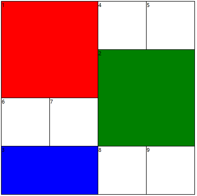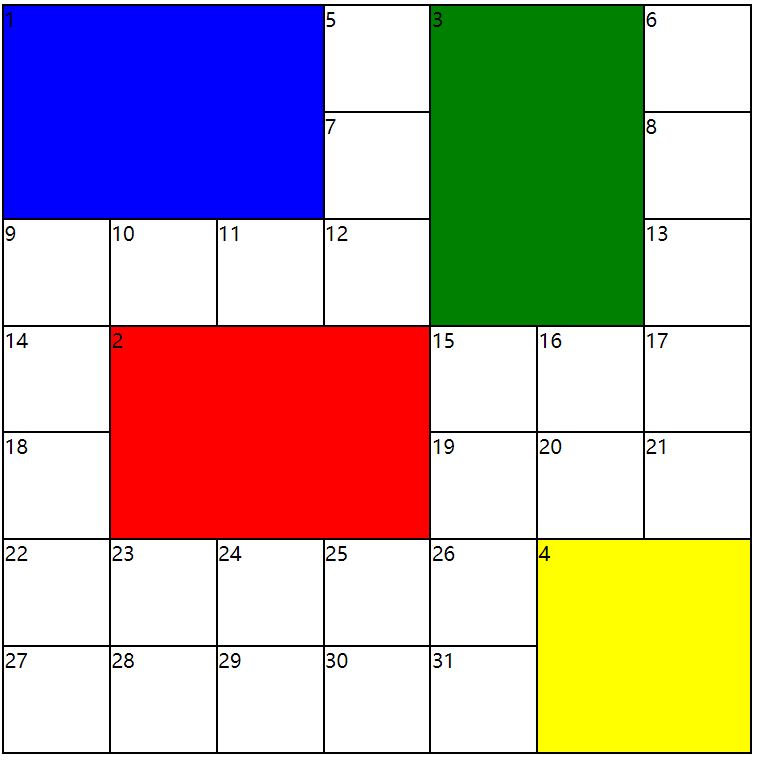 对于效果图1,gridArea = [[1,1,2,2],[2,3,2,2],[4,1,1,2]]。 整个4X4网格共有3个非1X1大小的子网格。 其中[1,1,2,2]就说明这个4X4的网格中有一个从第一行第一列开始,跨行跨列都为2的子网格。