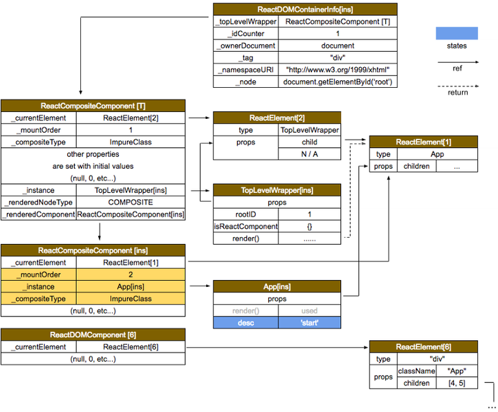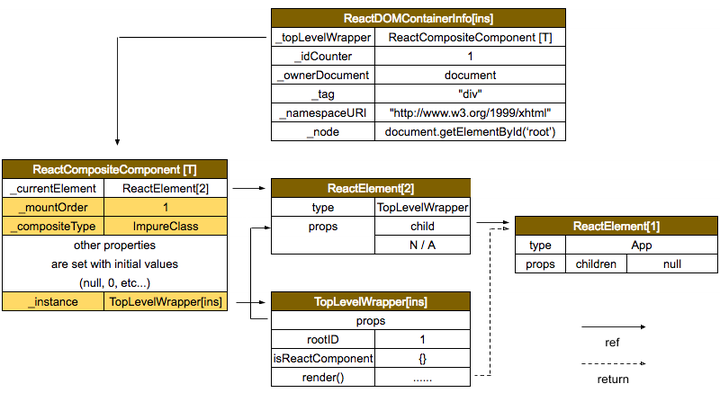然后(我们叫她)App[ins]被赋值给ReactCompositeComponent[ins]._instance,并且ReactInstanceMap被用来做反向链接。
