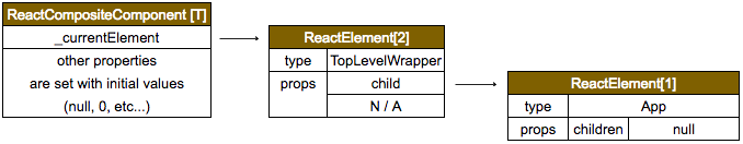 2)TopLevelWrapper会被实例化,然后被设置给ReactCompositeComponent[T]._currentElement,同时其它的属性也会被初始化;