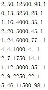 testData =[[2, 50,12500,98 ],[0, 13,3250,28 ],[1, 16,4000,35 ],[1, 24,6000,77 ],[4, 4,1000, 4]
