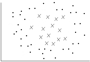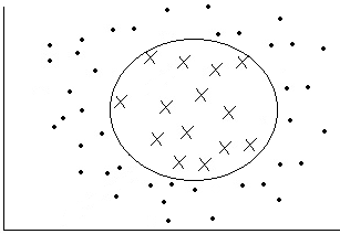 对于线性不可分问题,如图 2 所示,这类问题是无法用超平面划分正负样本数据的。倘若能将超平面换成超曲面,则可以将正负样本正确分类,如图 5 所示。